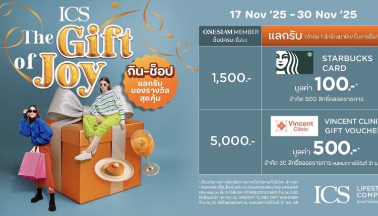 ICS Lifestyle Complex ตรงข้ามไอคอนสยาม เอาใจเหล่านักช้อปส่งท้ายปลายปี 2568 ด้วยโปรโมชั่นพิเศษ “ICS THE GIFT OF JOY” ให้ลูกค้าสมาชิก ONESIAM ได้อิ่มอร่อยและช้อปเพลิน พร้อมรับของขวัญเติมความสุข ฟรี! แบบสุดคุ้ม ตั้งแต่วันนี้ – 30 พฤศจิกายน 2568