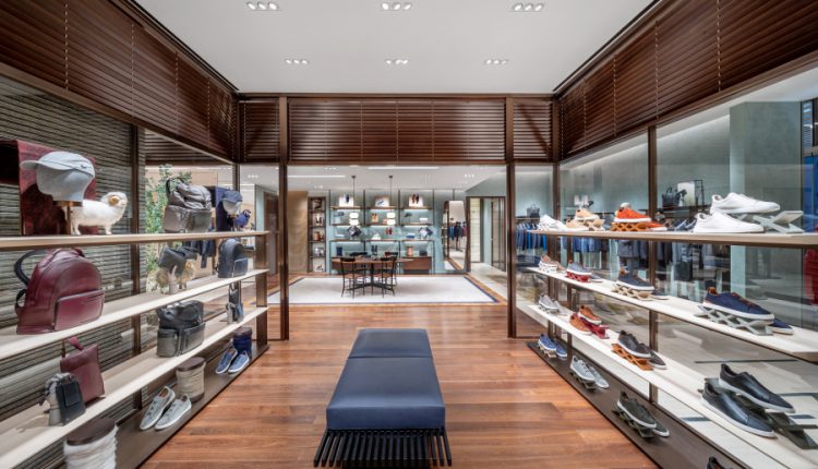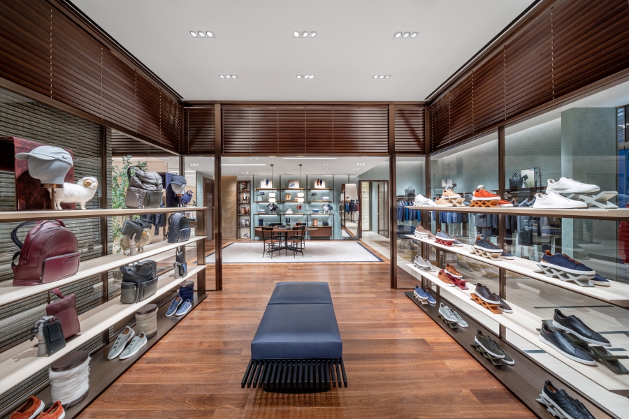 The store’s interior design employs a neutral colour palette, with walls decorated with ash wood and 3D plaster moldings. Natural rosewood display cases and luxurious metal racks, backlit with soft LED lights, showcase the refined details of Zegna’s clothing and accessories.