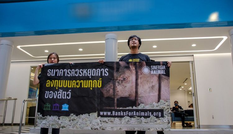 ซิเนอร์เจีย แอนนิมอล จัดกิจกรรมรณรงค์หน้าสำนักงานใหญ่ธนาคารกสิกรไทย เรียกร้องการลงทุนที่มีจริยธรรม